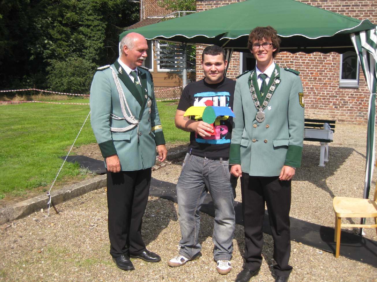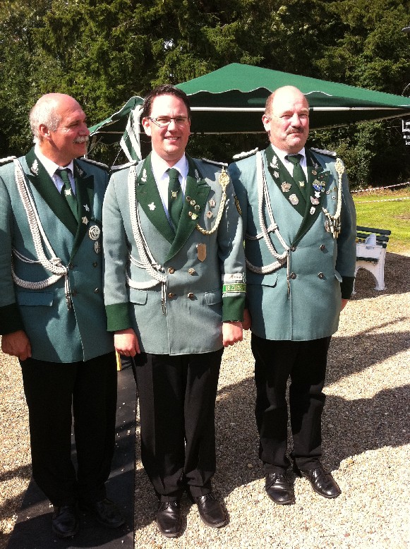23.06.2011 Fronleichnam mit Familientag und Königsvogelschuss Der Tag begann für die Schützen traditionsgemäß mit der Teilnahme an der Heiligen Fronleichnams-Messe, die in diesem Jahr in der Titzer Kirche St. Cosmas und Damian gefeiert wurde. Anschließend freuten sich alle Besucher und Schützen über das beständige Wetter ohne Regen und genossen den Familientag rund ums Leo-Lange-Haus in Rödingen. Die neue große Riesenrutsche begeisterte die kleinen Kinder und auch so manchen Jugendlichen! Der Grillstand, die Cafeteria und der Eisstand wurden neben den Getränken reichlich genossen und schmeckten sehr gut. Viele nahmen am Schießen der Ortsvereine um den Ortswanderpokal und am Ausschießen der Hans Weber Erinnerungstafel teil. Beim Preisvogelschießen hatte man den Eindruck, dass der eine oder andere es zur Übung nutzte, um beim späteren Majestätsschießen gut auszusehen. Auf dem Schützenfest im Juli werden sie gekrönt und regieren dann für ein Jahr: König Thorsten Hompesch Prinz Stephan Hompesch Schülerprinz Kevin Abels Die Übergabe der Insignien und der kleine musikalische Umzug begleitet vom Jugendmusikzug Fidelio Eisdorf schlossen den offiziellen Teil. Gemütlich gefeiert wurde noch bis in den Abend hinein. Die St. Sebastianus Schützenbruderschaft Rödingen bedankt sich bei allen Gästen.