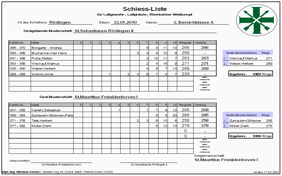 Einzelwertung mit Zwei Streichergebnissen 1. Zurkaulen Peter Freialdenhoven 14(14) 3374 281.17 276|279|281|282|273|274|271|285|285|287|287|284|279|275| 2. Nitschke Siegfried Jülich I 14(14) 3367 280.58 283|283|273|283|286|280|287|276|281|278|272|279|277|274| 3. Schiffer Wolfgang Broich I 14(14) 3309 275.75 268|277|270|274|271|281|283|270|273|280|273|269|279|278| 4. Domath Sascha Gevenich I 14(14) 3271 272.58 261|277|272|275|270|277|272|275|270|270|263|266|277|270| 5. Vonderbank Christiane Jülich I 13(14) 3253 271.08 270|262|278|274|279|265|269|276|269|268|267|263| 0|275| 6. Müller Dirk Freialdenhoven 14(14) 3236 269.67 254|270|262|277|278|261|263|274|278|268|265|269|271|248| 7. Vonder Lohe Richard Pattern I 13(14) 3226 268.83 254|259|262|270|274|278|270|265|274|271|269| 0|266|268| 8. Korbel Walter Gevenich I 14(14) 3225 268.75 262|276|263|263|274|257|267|270|256|272|265|259|279|275| 9. Schall Ruth Broich I 14(14) 3216 268.00 250|264|266|264|266|281|277|271|258|271|268|263|256|267| 10. Kanehl Sebastian Freialdenhoven 14(14) 3214 267.83 269|272|264|269|261|268|255|266|268|268|269|264|269|268| 11. Weber Hans-Günter Rödingen IV 14(14) 3202 266.83 253|277|254|261|265|266|257|273|264|264|270|273|262|270| 12. Weber Herbert Rodingen II 14(14) 3187 265.58 273|270|269|264|257|273|253|264|269|260|240|262|256|270| 13. Buchacker Karl -Hans Rodingen II 12(14) 3175 264.58 255|261|272|274|269|265| 0| 0|258|270|257|265|263|266| 14. Crützen Dagmar Broich I 13(14) 3170 264.17 0|258|255|261|257|252|267|272|271|257|278|262|266|266| 15. Klems Christian Welldorf I 14(14) 3164 263.67 258|266|263|267|255|259|263|268|264|268|261|261|256|266| 16. Bongartz Andrea Rodingen II 14(14) 3160 263.33 253|225|261|268|253|268|261|269|266|262|265|256|256|275| 17. Tetz Herbert Freialdenhoven 12(14) 3156 263.00 0|246|267|274|271|274| 0|262|258|268|255|262|266|253| 18. Mannheims Heinz Gevenich I 14(14) 3152 262.67 259|261|257|263|269|255|255|273|260|273|236|257|258|267| 19. Weckauf Markus Rodingen II 14(14) 3148 262.33 249|267|255|268|270|255|263|263|271|259|258|255|261|258| 20. Vonderbank Helmut Jülich I 13(14) 3129 260.75 261|256|264|249|255|267|263|262|262|267|260|249| 0|263| 21. Kickartz Stefan Pattern I 14(14) 3128 260.67 261|262|260|264|252|257|266|254|262|264|256|253|269|253| 22. Heinrichs Hubert Gevenich I 13(14) 3119 259.92 254|259|255| 0|265|253|261|259|254|266|267|266|260|252| 23. Hirsch Michael Rödingen IV 14(14) 3101 258.42 209|225|261|258|266|261|278|263|249|253|254|266|246|246| 24. Nersheimer Rita Gevenich I 14(14) 3100 258.33 263|257|256|260|254|262|260|258|252|256|249|254|263|257| 25. Drexler Stefan Welldorf I 14(14) 3059 254.92 247|249|248|254|255|247|253|255|255|270|265|241|252|256| 26. Kreutz Elke Welldorf I 14(14) 3051 254.25 258|254|257|244|246|223|255|248|251|256|255|259|256|256| 27. Pörner Birgit Pattern I 14(14) 3006 250.50 248|242|249|241|231|243|258|249|247|254|245|259|265|247| 28. Oligslager Toni Welldorf I 14(14) 2972 247.67 248|257|242|236|251|252|249|250|244|241|232|251|251|234| 29. Mielke Tobias Rödingen IV 14(14) 2955 246.25 241|246|248|227|240|262|230|219|255|238|262|245|241|247| 30. Nelles Leo Jülich I 13(14) 2952 246.00 242| 0|251|239|225|246|251|245|254|240|241|235|251|257| 31. Dohle Marcel Rödingen IV 14(14) 2948 245.67 235|240|175|211|242|214|245|248|253|246|266|257|257|245| 32. Jankowski Herbert Jülich I 13(14) 2869 239.08 221| 0|250|244|222|240|233|255|237|245|228|241|236|238| 33. Worms Anne Rodingen II 13(14) 2843 236.92 223|232|238|229| 0|224|243|244|235|230|235|249|243|241| 34. Gerken Carina Rödingen IV 12(14) 2836 236.33 241| 0|204|239|245|235|254|239|237|241|228|245| 0|228| 35. Kück Sascha Pattern I 12(14) 2806 233.83 249|231| 0|244|241|220|195|226| 0|221|239|233|259|248| 36. Rumpf Carola Broich I 13(14) 2711 225.92 170| 0|229|204|227|199|246|216|229|236|253|226|222|224| 37. Malejka Jan Broich I 12(14) 2426 202.17 187|197|214|191| 0|202|194|174|195|227|227|207| 0|211|